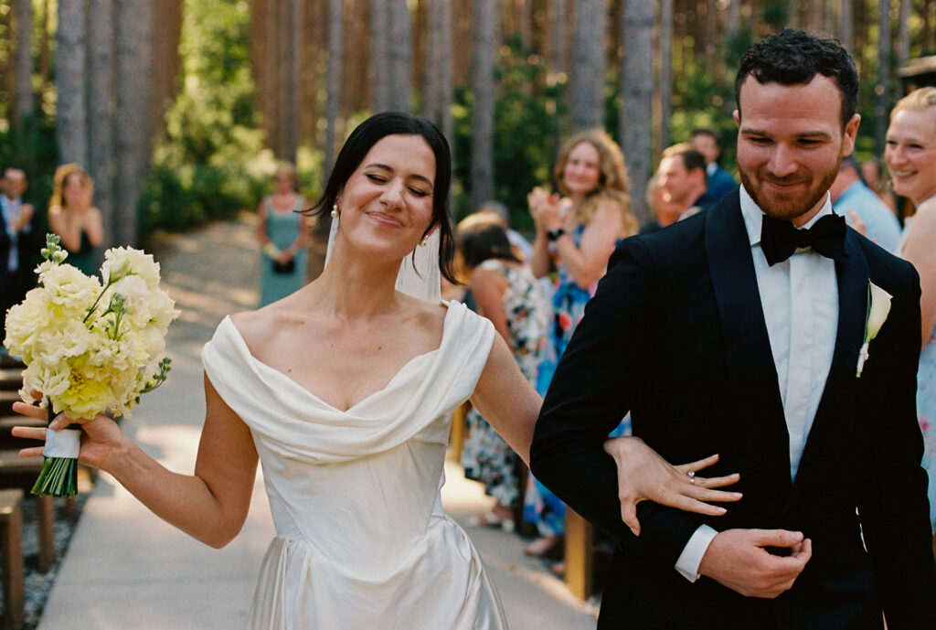Emma and Isaac walk down the aisle at Pinewood, smiling at each other as their guests applaud.